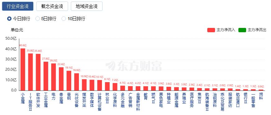 行业资金方面,截至收盘,小金属、IT服务、软件开发等净流入排名靠前,其中小金属净流入40.65亿。