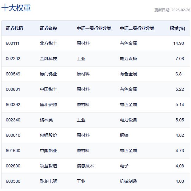 中证稀土产业指数主要权重