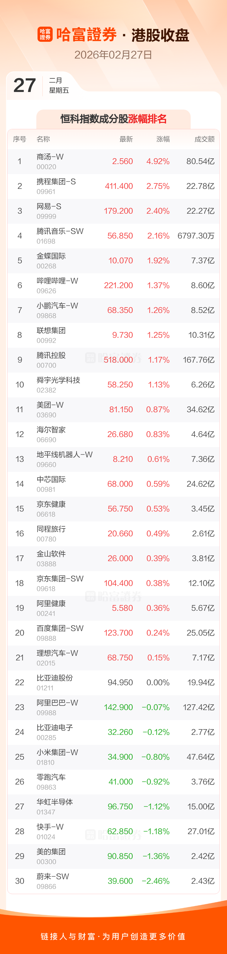 港股2月27日收盘走高,恒生指数收报26630.54点,涨249.52点,涨幅0.95%;恒生科技指数收报5137.84点,涨28.51点,涨幅0.56%。恒生指数成分股中新鸿基地产、药明生物、中国神华涨幅居前,中国宏桥、中国生物制药、百威亚太跌幅靠前。恒生科技指数成分股中商汤-W、携程集团-S、网易-S涨幅居前,蔚来-SW、美的集团、快手-W跌幅靠前。