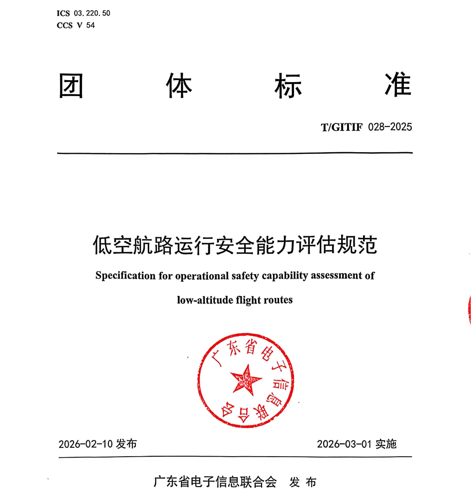 近日,由广东省低空经济产业发展有限公司(以下简称“广东低空经济公司”)牵头编制的《低空航路运行安全能力评估规范》团体标准正式发布,将于3月1日实施。本标准填补了国内低空航路运行安全能力评估领域的标准空白,是广东省低空经济标准化体系建设的重要成果。