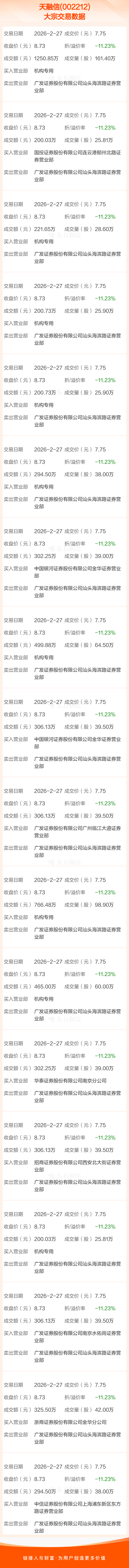 2026年2月27日,天融信发生18笔大宗交易,共成交870.82万股,成交金额6748.90万元,占其流通市值比例为0.66%。