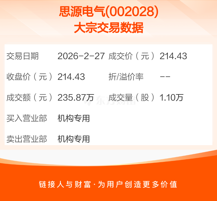 2026年2月27日,思源电气发生1笔大宗交易,共成交1.10万股,成交金额235.87万元。
