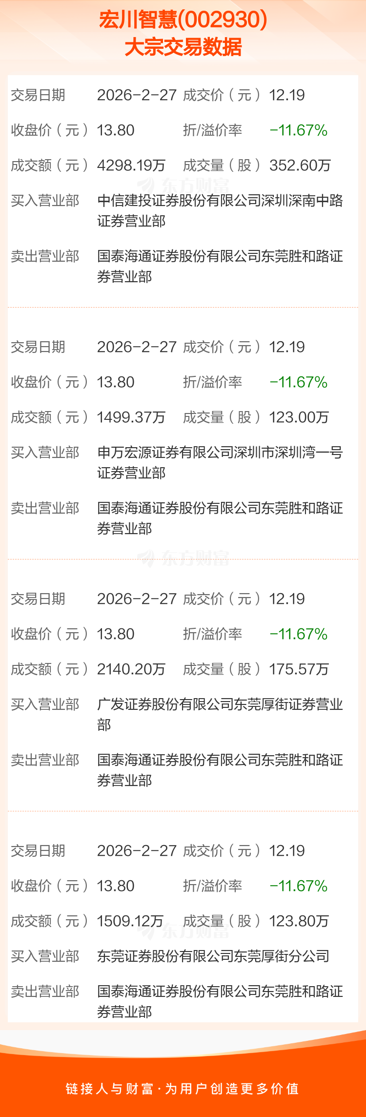 大宗交易:宏川智慧成交9446.88万元,折价11.67%(2-27)
