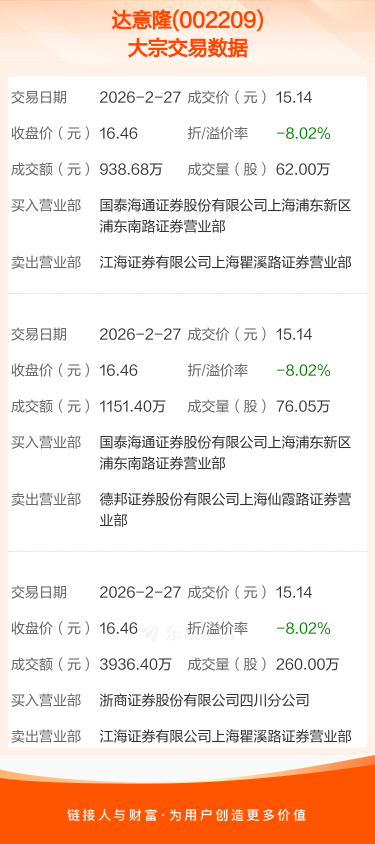 2026年2月27日,达意隆发生3笔大宗交易,共成交398.05万股,成交金额6026.48万元,占其流通市值比例为2.34%。