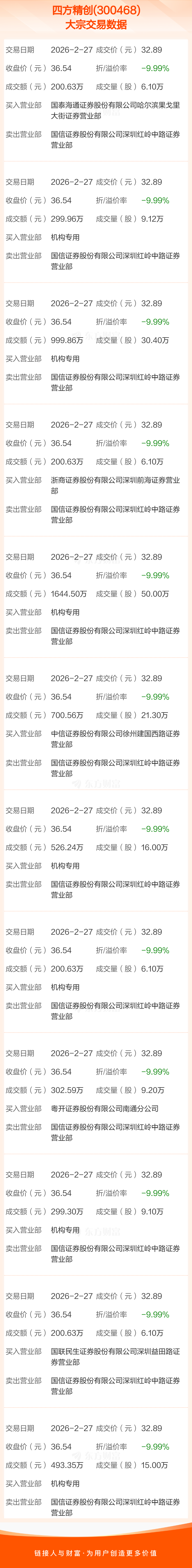 大宗交易:四方精创成交6068.88万元,折价9.99%(2-27)