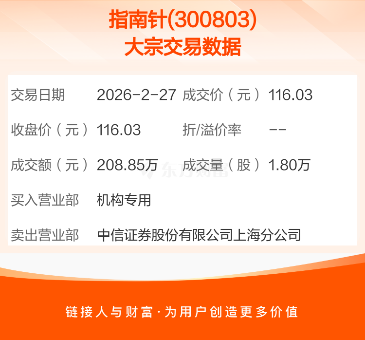 2026年2月27日,指南针发生1笔大宗交易,共成交1.80万股,成交金额208.85万元。