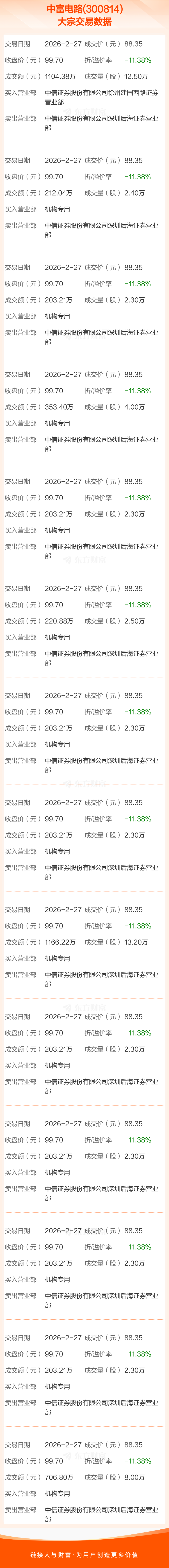 2026年2月27日,中富电路发生14笔大宗交易,共成交61.00万股,成交金额5389.40万元,占其流通市值比例为0.28%。