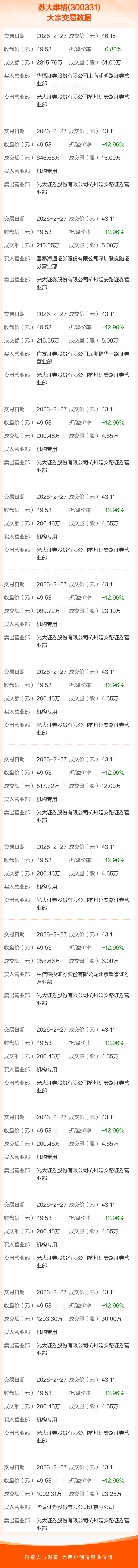 2026年2月27日,苏大维格发生17笔大宗交易,共成交217.64万股,成交金额9568.50万元,占其流通市值比例为0.92%。