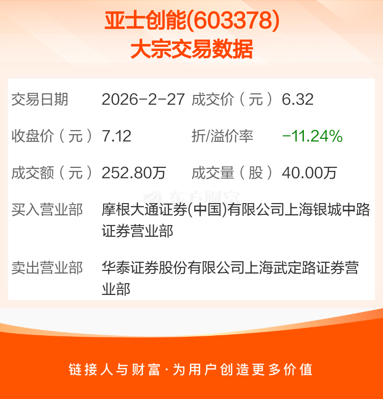 大宗交易:亚士创能成交252.80万元,折价11.24%(2-27)