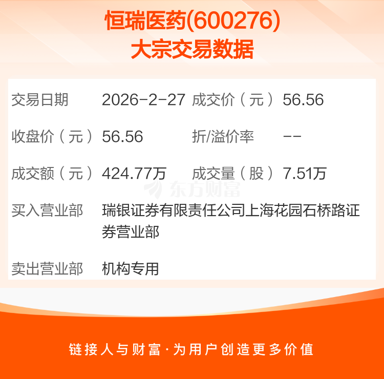 大宗交易:恒瑞医药成交424.77万元(2-27)
