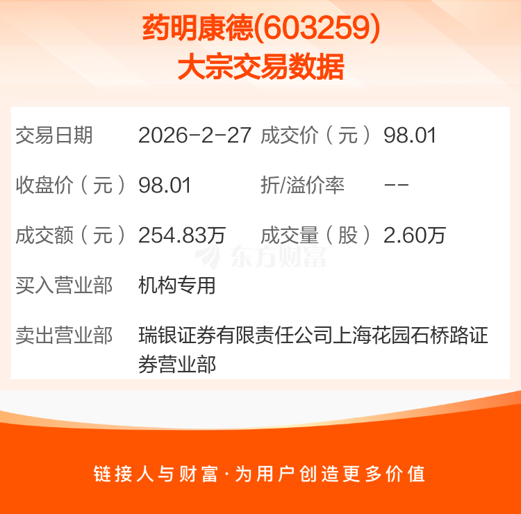 2026年2月27日,药明康德发生1笔大宗交易,共成交2.60万股,成交金额254.83万元。