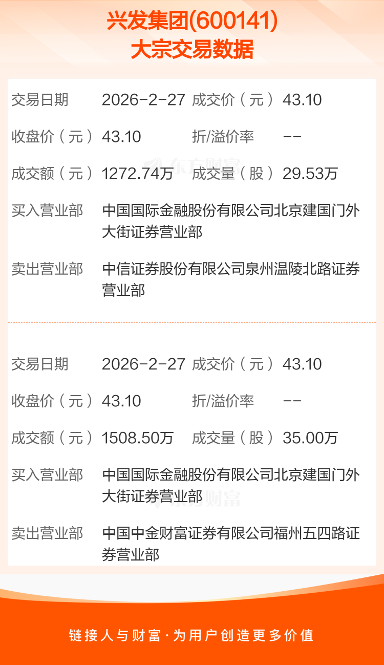 2026年2月27日,兴发集团发生2笔大宗交易,共成交64.53万股,成交金额2781.24万元,占其流通市值比例为0.06%。