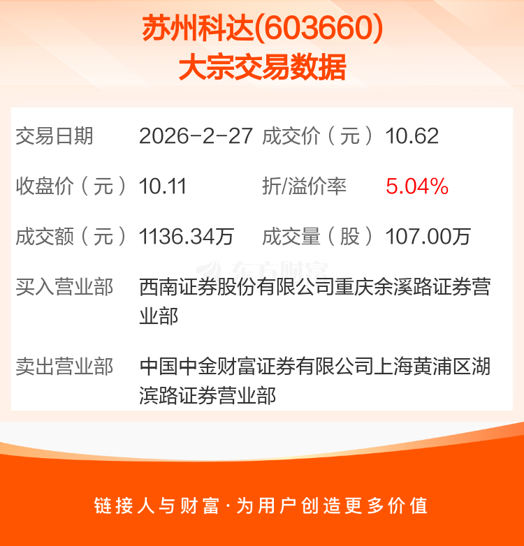2026年2月27日,苏州科达发生1笔大宗交易,共成交107.00万股,成交金额1136.34万元,占其流通市值比例为0.20%。