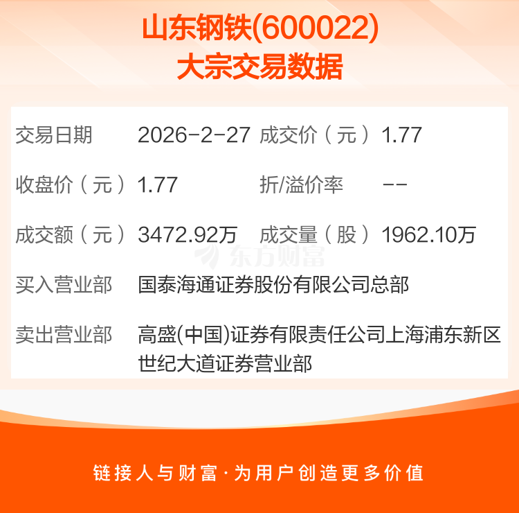 2026年2月27日,山东钢铁发生1笔大宗交易,共成交1962.10万股,成交金额3472.92万元,占其流通市值比例为0.18%。