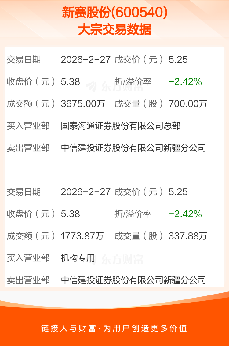 大宗交易:新赛股份成交5448.87万元,折价2.42%(2-27)