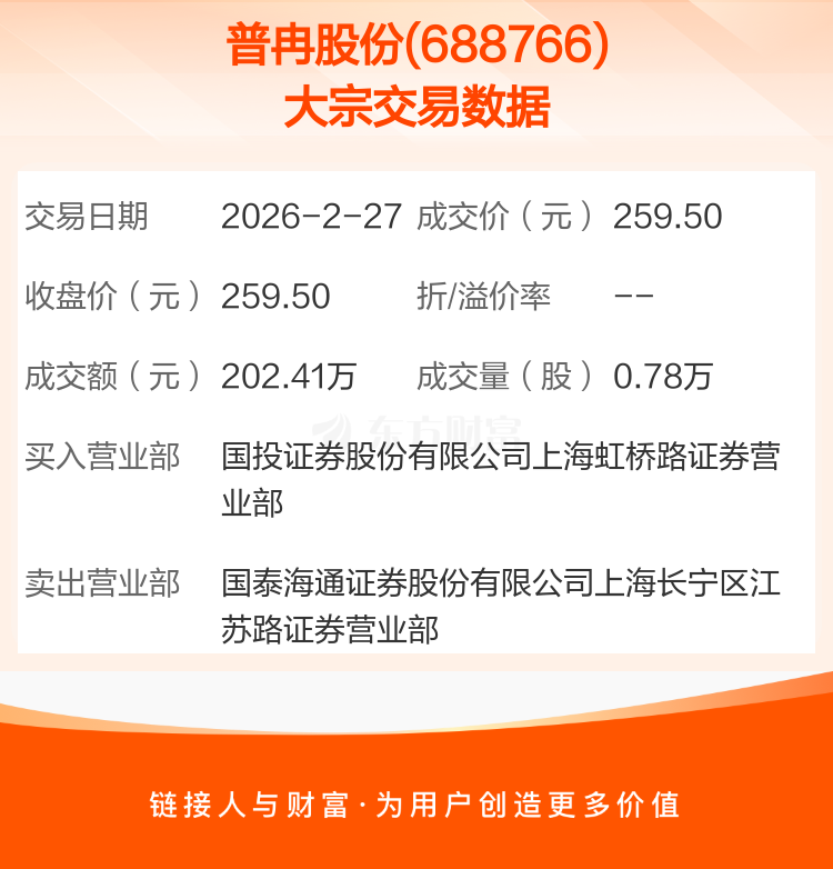 2026年2月27日,普冉股份发生1笔大宗交易,共成交7800股,成交金额202.41万元。