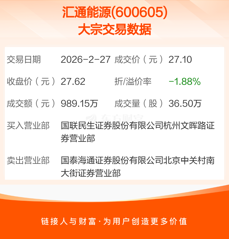 2026年2月27日,汇通能源发生1笔大宗交易,共成交36.50万股,成交金额989.15万元,占其流通市值比例为0.17%。