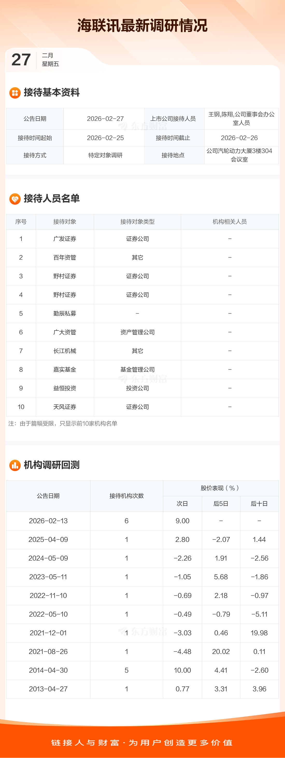 海联讯2月27日公告称,2月25日至2月26日接待广发证券等34家机构调研。接待人员包括王钢,陈翔,公司董事会办公室人员。