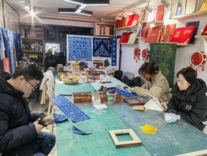 与此同时,酒店管理学院的另一支队伍走进嘉定安亭的药斑布工作室。在传承人指导下,学生们体验从设计制版到清洗装裱的完整印染流程。在完成“十二生肖”纪念相框的制作后,成员们深刻体会到手工艺的艰辛与价值。团队还发挥创意,设计了融合校园元素的相框及“落樱缤纷”方巾图样,并计划推动药斑布文创进入高校市场。