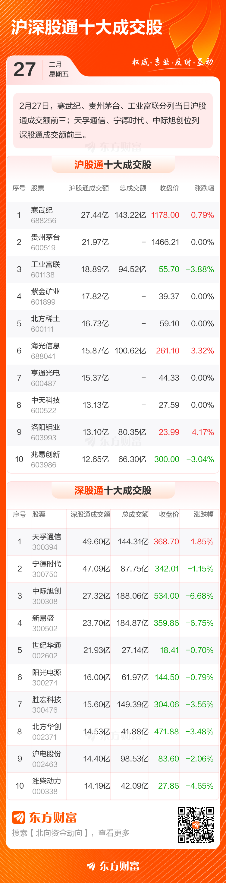 2月27日北向资金最新动向(附十大成交股)