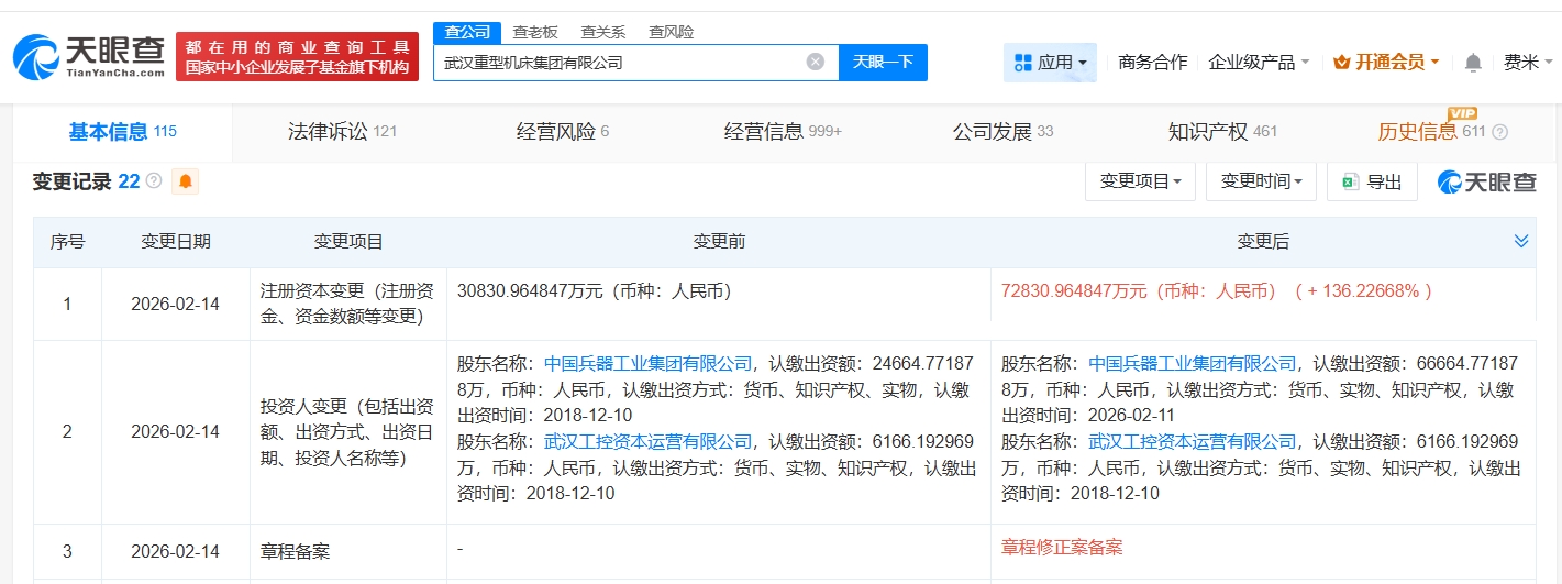 南方财经2月27日电,天眼查App显示,近日,武汉重型机床集团有限公司发生工商变更,注册资本由约3.1亿人民币增至约7.3亿人民币,增幅约136%。该公司成立于2001年11月,法定代表人为丁剑,经营范围包括金属切削机床制造、金属切削机床销售、金属成形机床制造、金属成形机床销售等,由中国兵器工业集团有限公司、武汉工控资本运营有限公司共同持股。