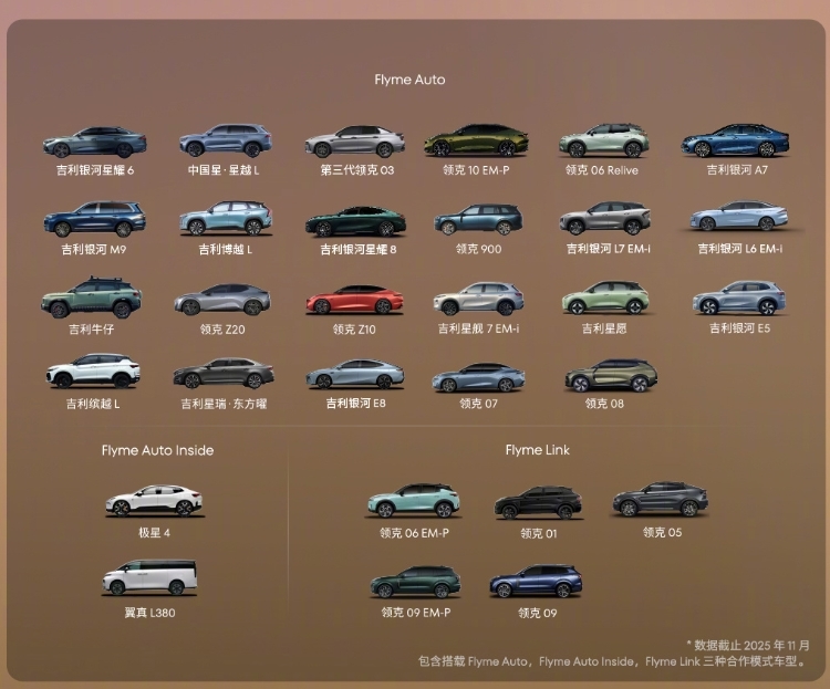 依托吉利在整车制造、渠道布局的优势,FlymeAuto的上车速度与市场覆盖范围持续提升,2025年11月新增销量超20.1万辆,首次实现单月20万级用户增长,其中插混车型贡献了超40%的用户增量。