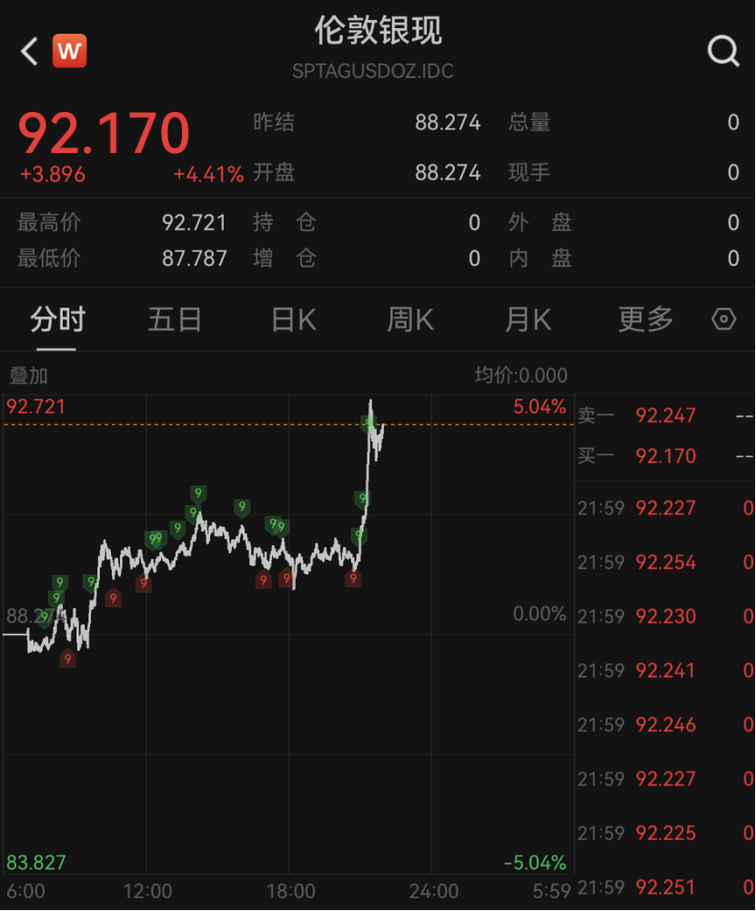 北京时间2月27日晚间,国际黄金、白银价格直线拉升,截至22:00,现货黄金涨0.68%,现货白银价格大涨超4%,COMEX白银期货大涨超5%,现货铂金大涨超4%。