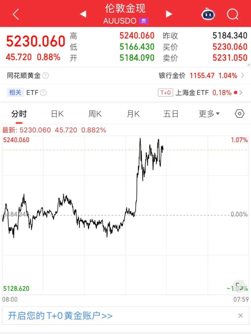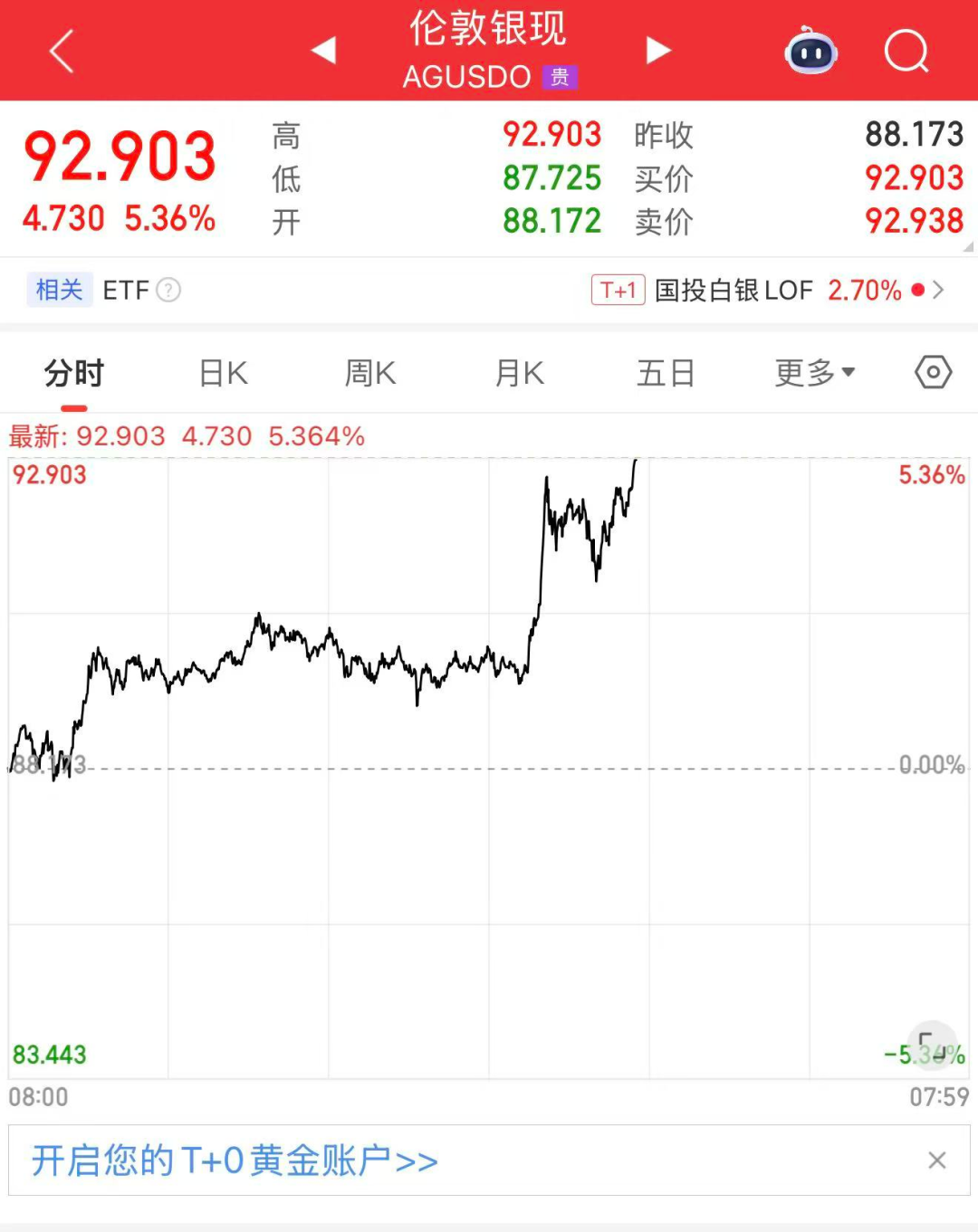 截至发稿,伦敦金现报5230.06美元/盎司,日内涨0.88%;伦敦银现报92.903美元/盎司,日内涨5.36%。