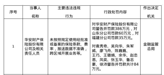 华安财险被罚386万,山东分公司被罚60万,福建分公司被罚35万