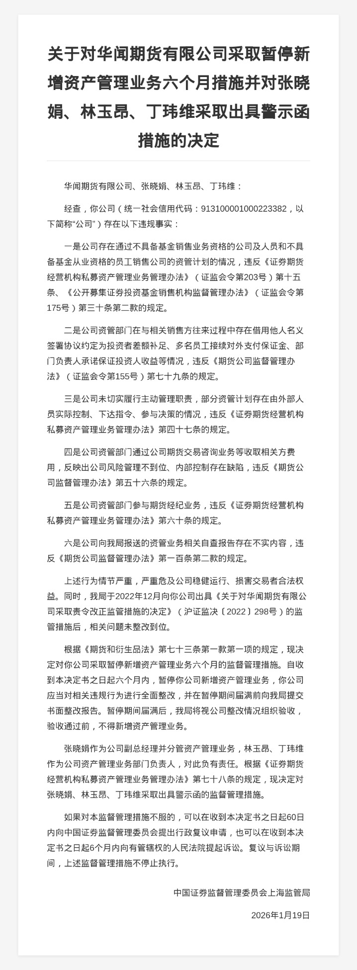 针对以上问题,中国证券监督管理委员会上海监管局现决定对华闻期货有限公司采取暂停新增资产管理业务六个月的监督管理措施,对张晓娟、林玉昂、丁玮维采取出具警示函的监督管理措施。