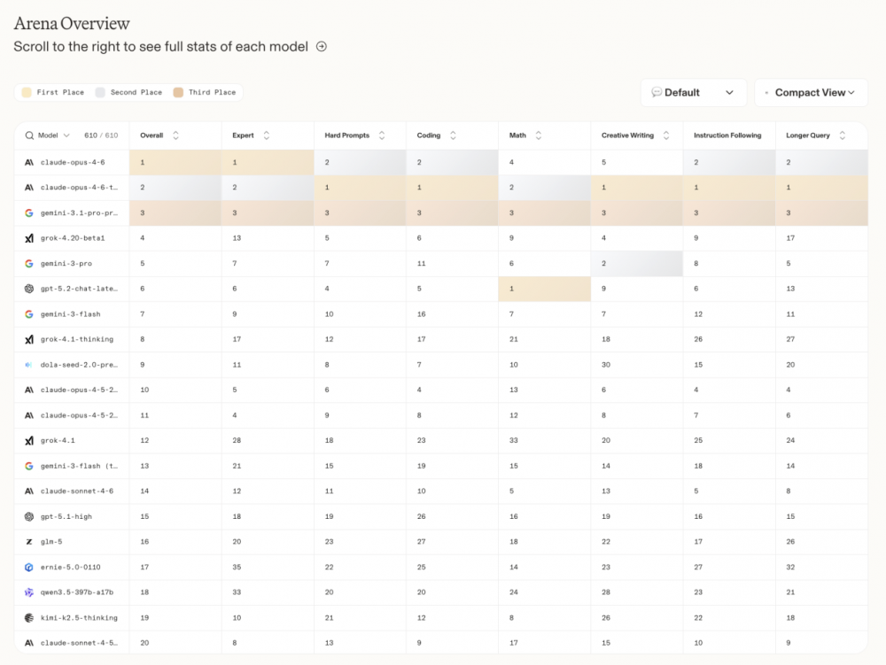 本次 LMArena 综合榜单头部席位仍由国际主流大模型占据,榜单前三依次为 claude-opus-4-6、gemini-3.1-pro-pr、grok-4.20-beta1;国产阵营中,Seed 2.0 位列综合榜单第 9 位,是唯一进入全球前十的国产大模型。