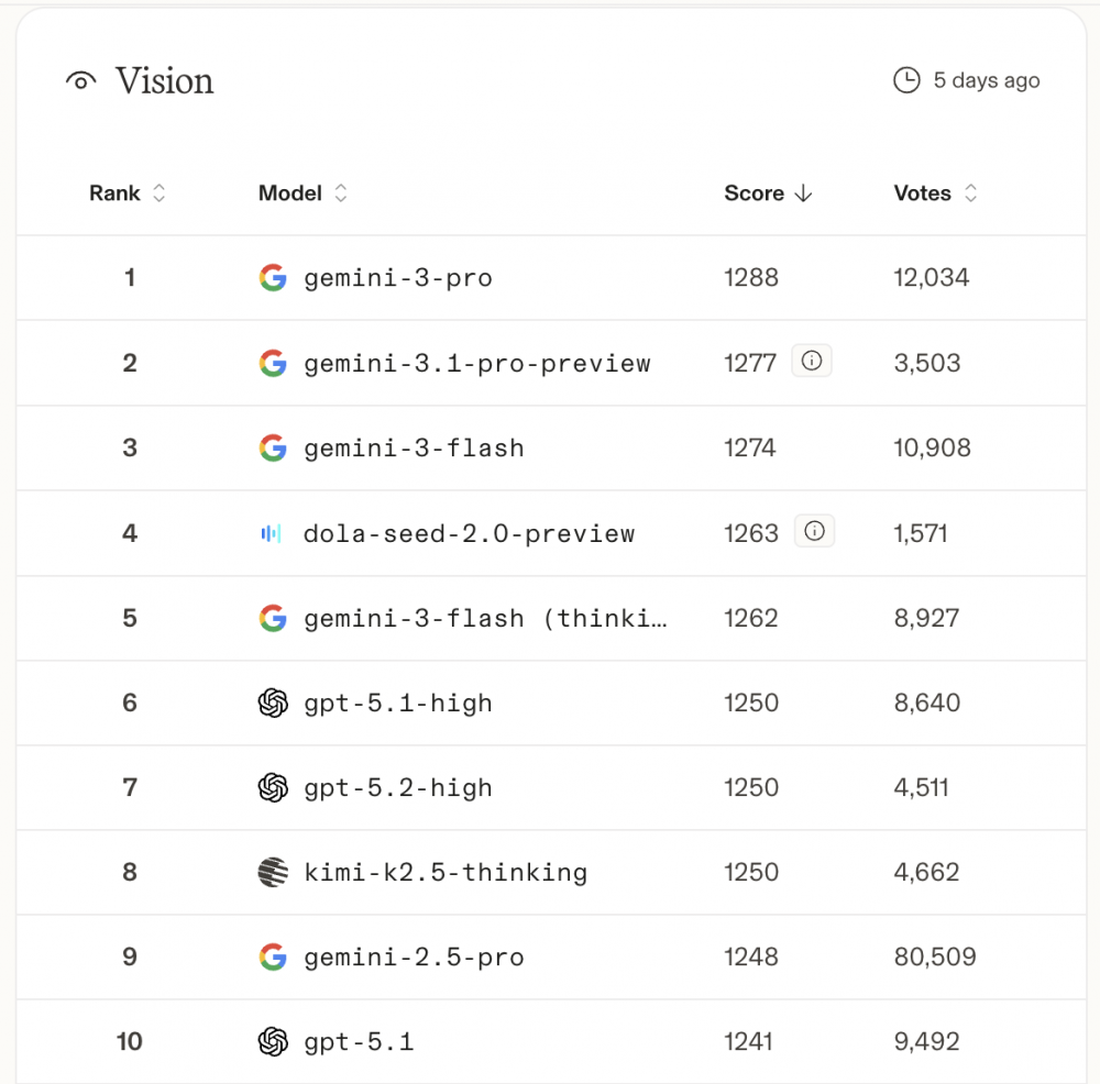 在视觉理解(Vision)维度,Seed 2.0排名第4,仅次于Gemini的三款模型。此前在综合排名中稍显靠后的 Kimi K2.5-thinking ,在视觉赛道成功跻身全球前十。