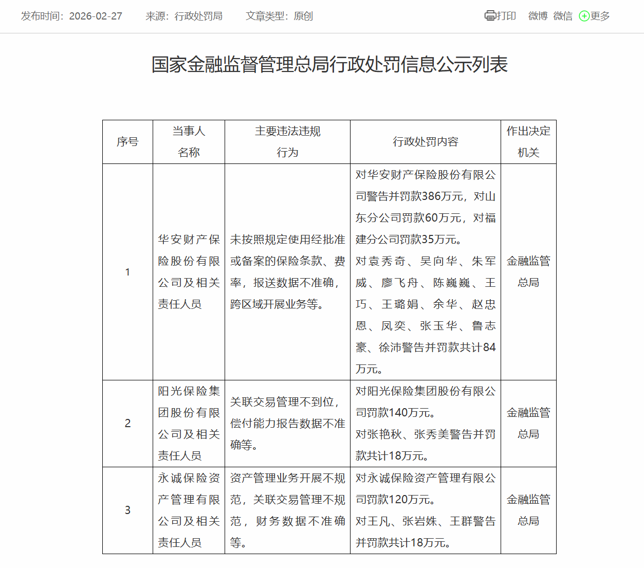 2月27日,金融监管总局在2026年首度披露罚单。