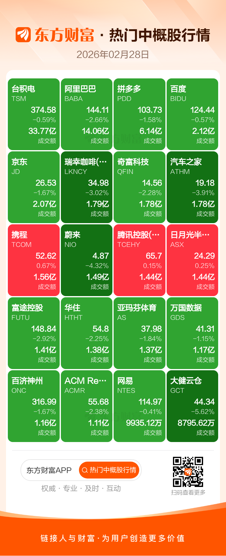 台积电跌0.59%,阿里巴巴跌2.66%,拼多多跌1.58%,百度跌0.57%,京东跌1.67%,瑞幸咖啡(ADR)跌3.02%,奇富科技跌2.28%,汽车之家跌3.91%,携程涨0.67%,蔚来跌4.32%。