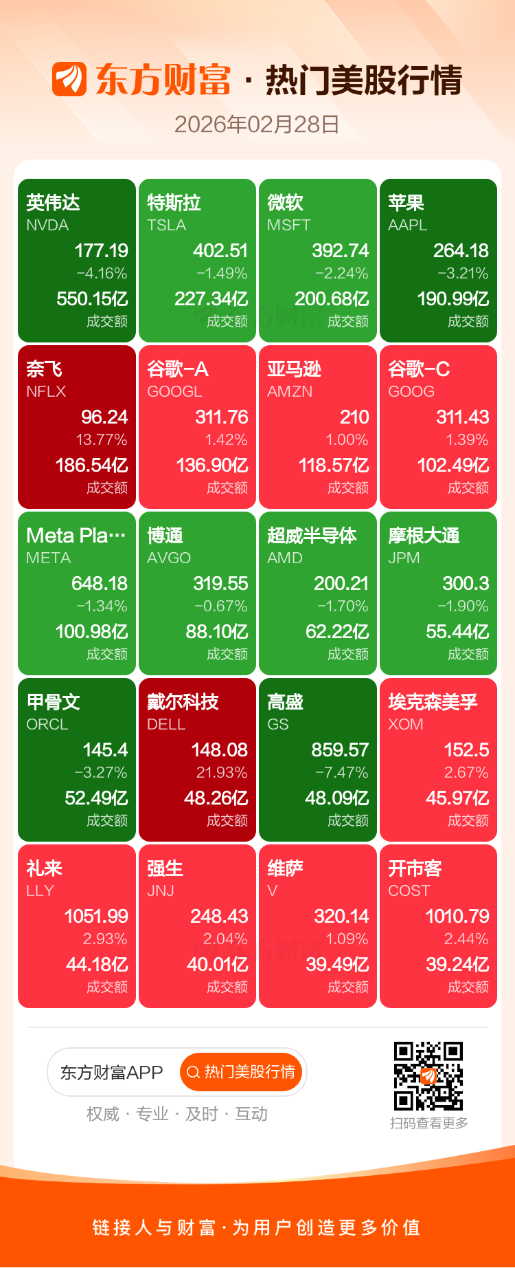 英伟达跌4.16%,特斯拉跌1.49%,微软跌2.24%,苹果跌3.21%,奈飞涨13.77%,谷歌-A涨1.42%,亚马逊涨1.00%,谷歌-C涨1.39%,Meta Platforms Inc-A跌1.34%,博通跌0.67%。