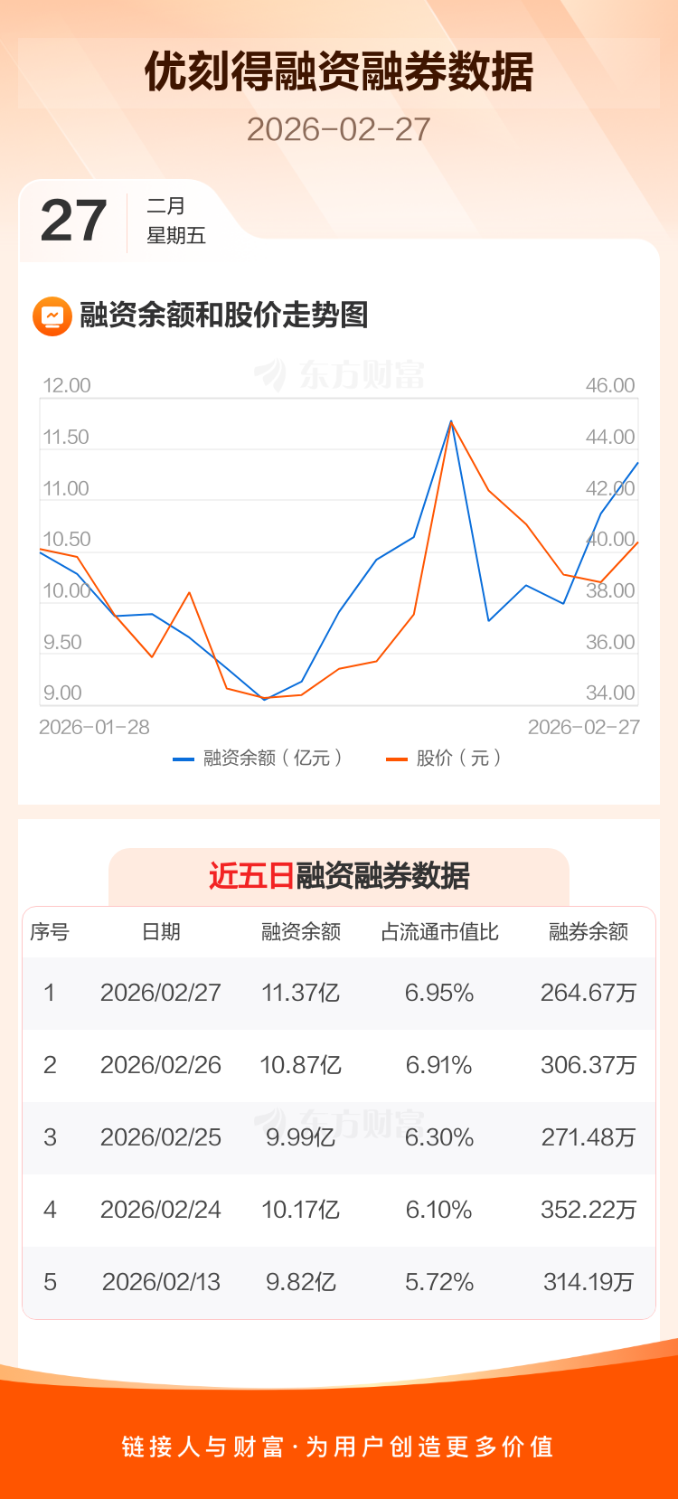 交易所最新数据显示,优刻得于2026年2月27日获融资买入3.94亿元,融资偿还3.44亿元,当日融资净买入4955.27万元。目前,该股融资余额11.37亿,占流通市值比例为6.95%。
