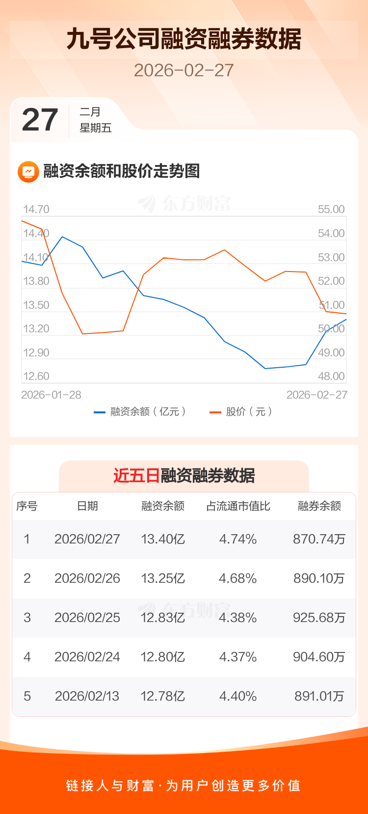 交易所最新数据显示,九号公司于2026年2月27日获融资买入4439.44万元,融资偿还2902.83万元,当日融资净买入1536.61万元。目前,该股融资余额13.40亿,占流通市值比例为4.74%。