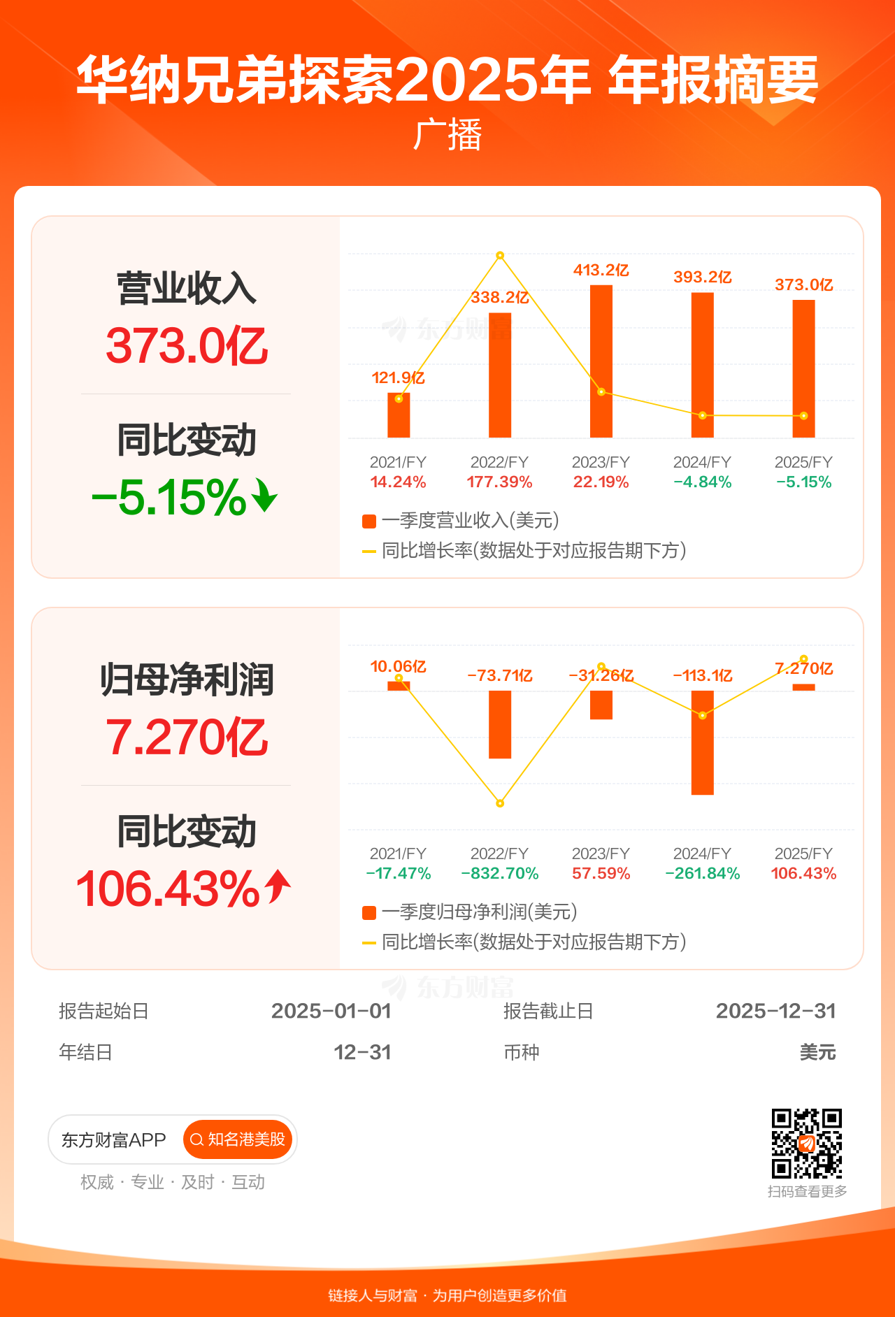 华纳兄弟探索2月26日发布年报业绩,截至2025年12月31日的12个月内,该公司营业收入372.96亿美元,同比减少5.15%;公司权益持有人应占溢利(归母净利润)7.27亿美元,同比增长106.43%。