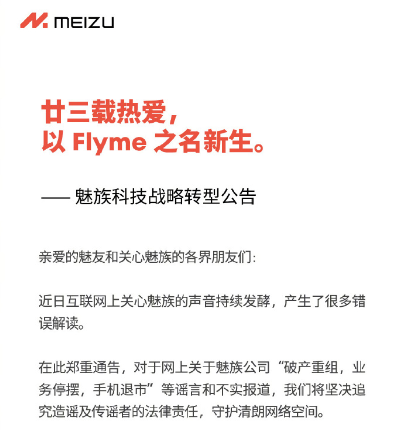 2月27日,在外界持续关注之下,魅族科技对外表示,网上关于魅族公司“破产重组,业务停摆,手机退市”的消息为谣言和不实报道。