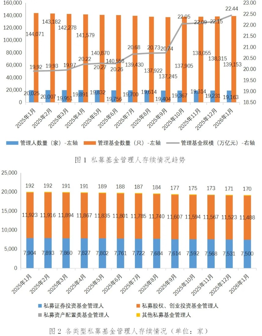 截至2026年1月末,存续私募基金管理人19,163家,管理基金数量[1]139,153只,管理基金规模[2]22.44万亿元。其中,私募证券投资基金管理人7,500家;私募股权、创业投资基金管理人11,488家;私募资产配置类基金管理人5家;其他私募投资基金管理人170家。