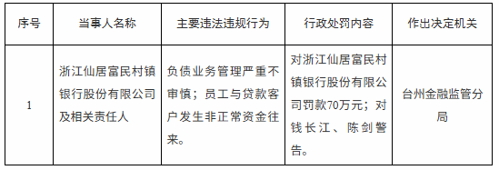 2月28日,国家金融监督管理总局台州监管分局网站披露的行政处罚信息显示,因负债业务管理严重不审慎、员工与贷款客户发生非正常资金往来,浙江仙居富民村镇银行被罚70万元,相关责任人钱长江、陈剑被警告。