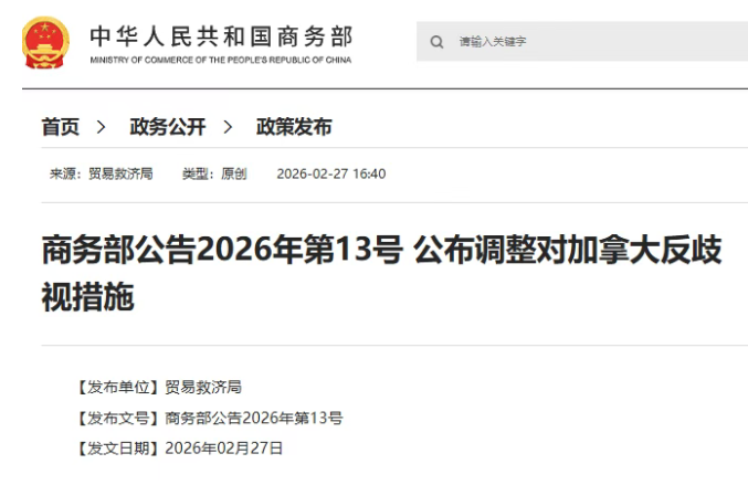 2月27日,商务部发布公告,公布调整对加拿大反歧视措施。