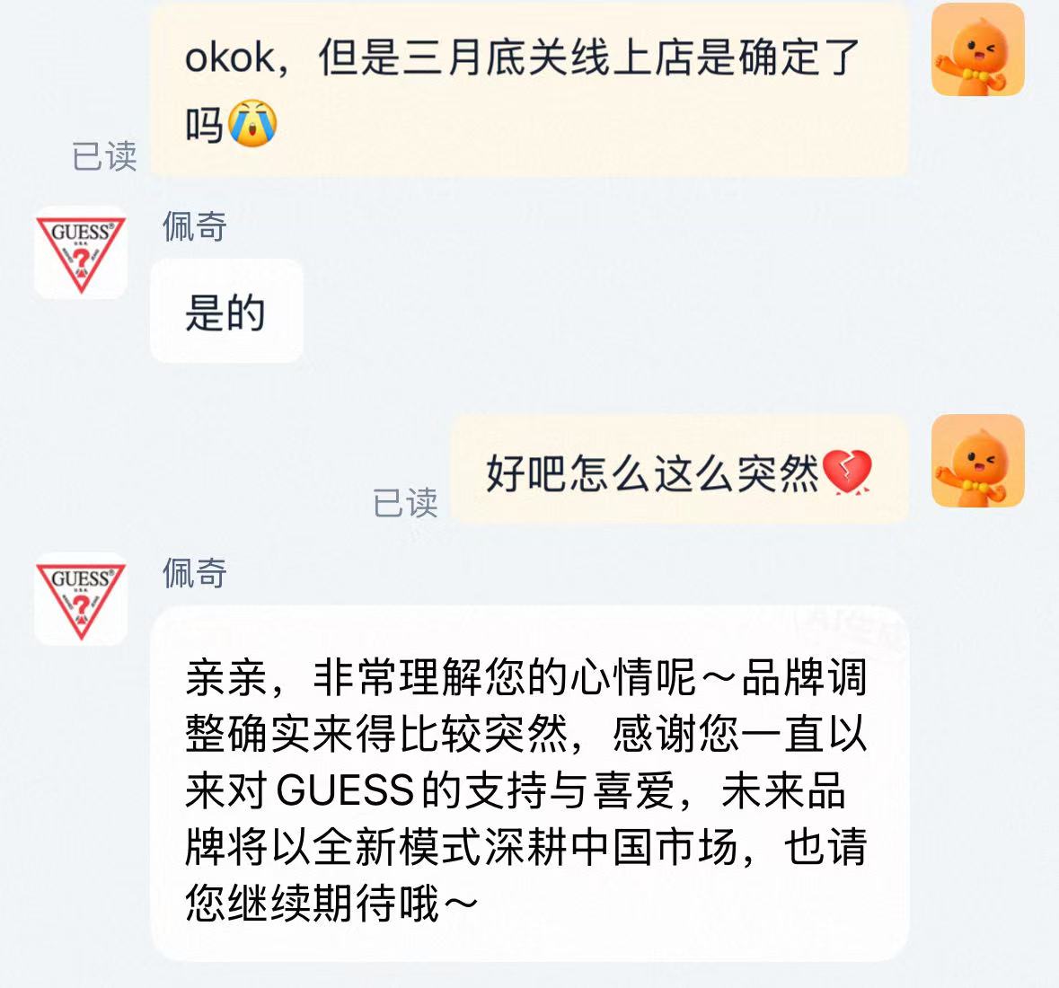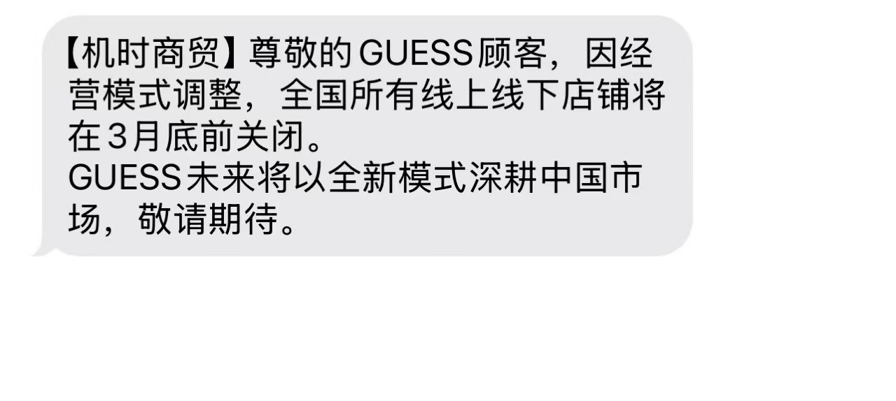 不少消费者也收到短信。Guess的匆忙离场让消费者在社交媒体上纷纷表示吃惊和可惜。