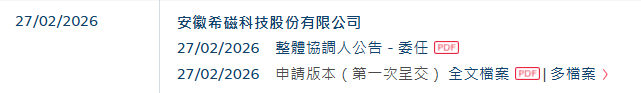 2月27日,港交所披露文件显示,安徽希磁科技股份有限公司已向港交所递交上市申请,该申请的独家保荐机构为中信建投国际。