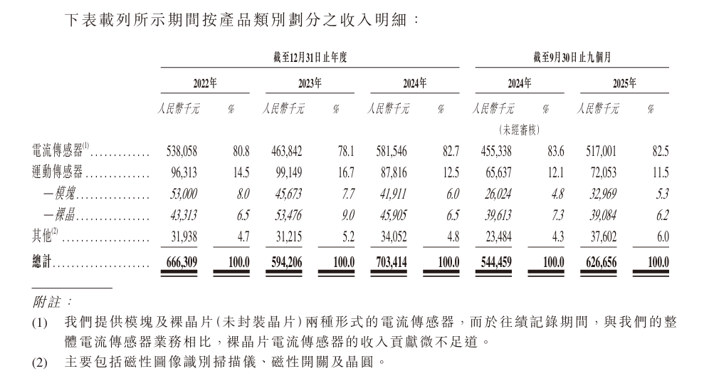 2022年至2024年三个年度,公司电流传感器的平均售价保持相对稳定,而运动传感器的平均售价则有所下降,主要由于裸晶形式运动传感器的销量占比上升,该定价远低于模块形式。截至2025年9月30日止九个月,电流传感器的平均售价有所下降,主要由于2025年度推出了价格相对较低但毛利率较高的新产品,致使产品组合发生变动。同期,运动传感器的平均售价进一步下降,主要由于下游需求增长,推动应用于智能手机及机器人且价格水平相对较低的产品销售增加。
