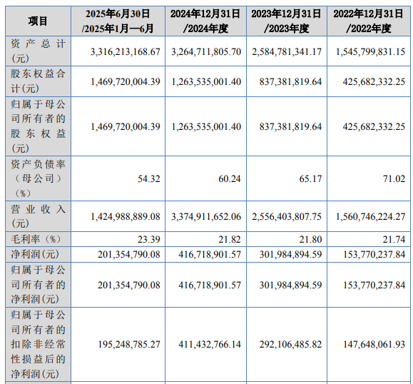 财务指标方面,招股书最新数据显示,2022年~2024年以及2025年1-6月,乔路铭营业收入分别为15.61亿元、25.56亿元、33.75亿元、14.25亿元;净利润分别为1.54亿元、3.02亿元、4.17亿元、2.01亿元;扣非净利润分别为1.48亿元、2.92亿元、4.11亿元、1.95亿元。