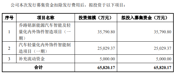 据招股书,乔路铭拟募集资金6.58亿元,用于新能源汽车智能及轻量化内外饰件智造项目(一期)、汽车轻量化内外饰件智能制造项目(一期)以及补充流动资金。