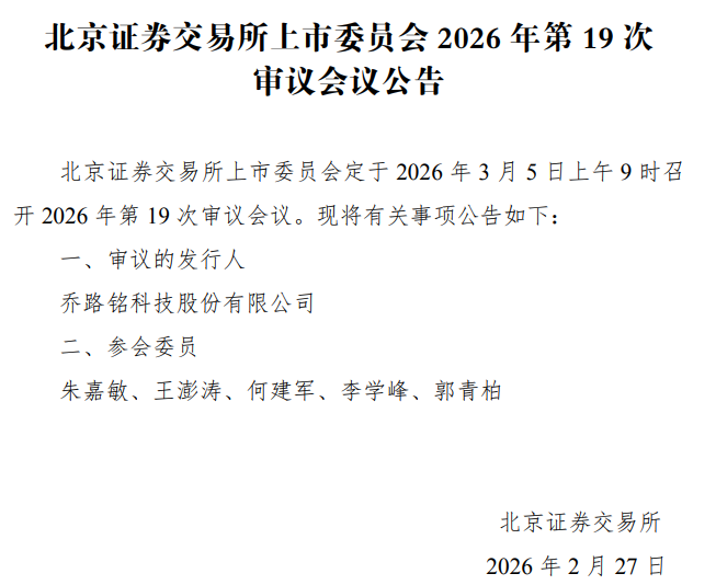 据北交所官网消息,北交所上市委员会定于2026年3月5日上午9时召开2026年第19次审议会议,审议的发行人为乔路铭科技股份有限公司(以下简称“乔路铭”)。