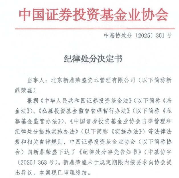 中基协称,上述事实系新鼎荣盛主动向监管部门如实说明情况,符合从轻、减轻处分情形,决定对新鼎荣盛进行警告。