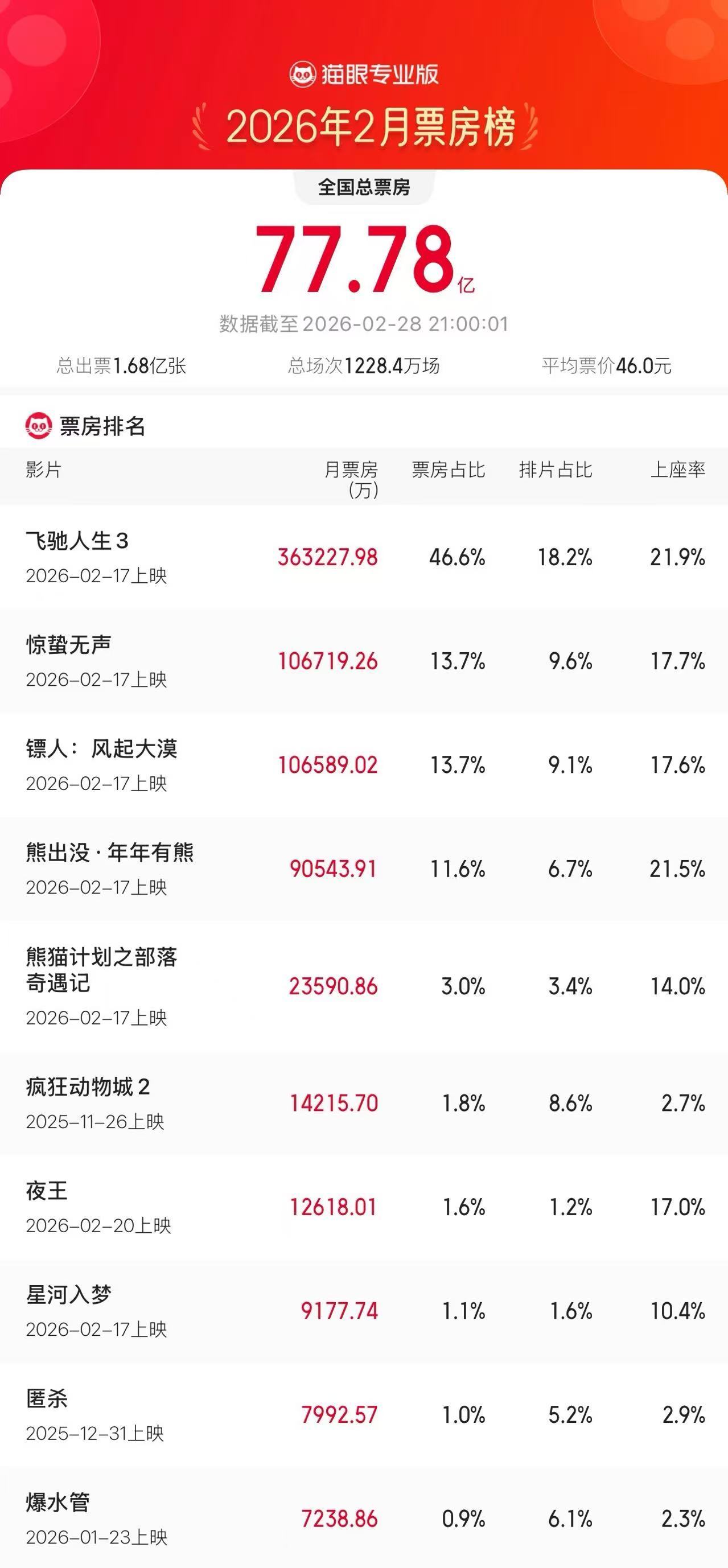 据猫眼专业版数据,截至2月28日21时,2026年2月总票房77.78亿,《飞驰人生3》成2月票房冠军,《惊蛰无声》《镖人:风起大漠》分列二三位。